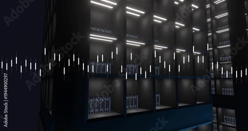 Showing modular server rack array glowing in data center with server blades and waveform lights