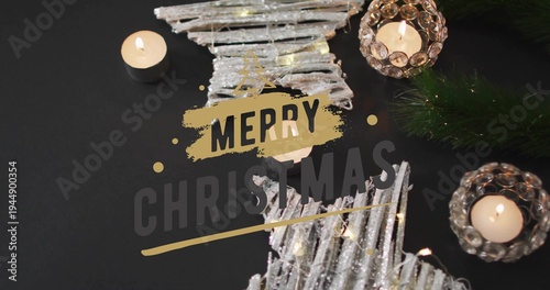 Shining star ornaments lying on black table, with tealight pine sprig fairy lights Merry Christmas