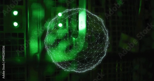 Glowing wireframe network sphere floating in data center, with green light bar and indicator lights