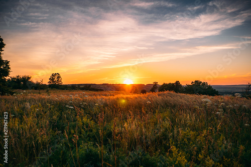 Beautiful summer sunset with waving wild grass in sunlight, rural meadow or field in countryside