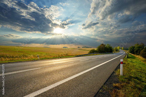 Empty asphalt road in rural landscape at sunset with dramatic clouds