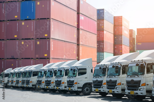 New haulage truck fleet is parking in the container depot as for shipping, logistics, business transportation background.