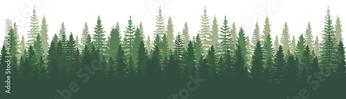 Forest Panorama view. Pines. Spruce nature landscape. Forest background. Set of Pine, Spruce and Christmas Tree on White background. Silhouette forest background. Vector illustration