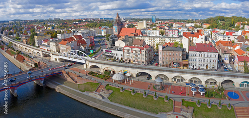 Panoramiczny widok z lotu ptaka na Bulwar i katedrę w centrum miasta Gorzów Wielkopolski