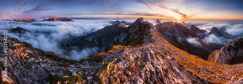 panorama über nebelmeer in den bayrischen alpen bei sonnenuntergang