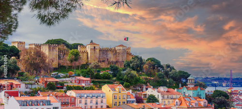 Panorama of the Lisbon city and Castelo de Sao Jorge, known as the Saint George historical castle, at sunset