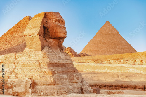 View of famous wonder of world Sphinx and pyramids Giza, Egypt