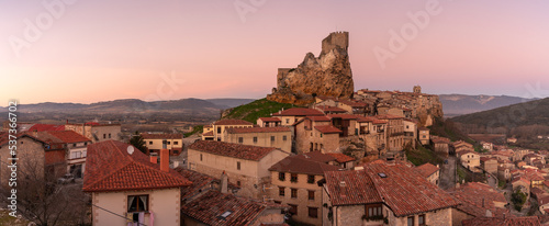 Panoramic landscape of the medieval village of Frías with old stone buildings and castle in the tophill at sunset, Burgos, Castile and Leon, Spain