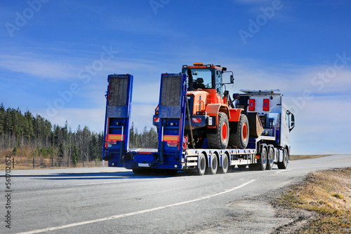 White Semi Truck Transports Wheel Loader, Rear View. Copy Space.