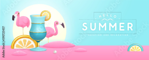 Summer party background with 3D plastic cocktail, tropic fruits and flamingo. Vector illustration