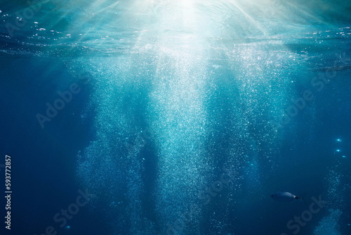 Sunlight underwater with bubbles rising to water surface in the sea, Mediterranean, France