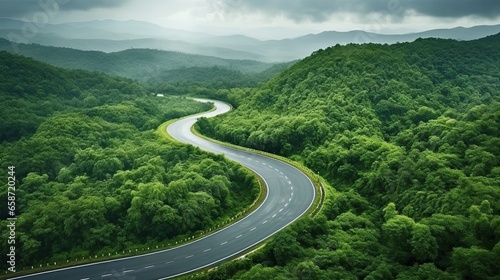 Aerial top view beautiful curve road on green forest in the rain season.