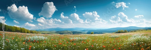 Wide panorama of a meadow with spring flowers. Generative AI.
