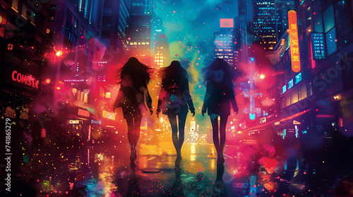 Ilustracja, kobiety nocą w mieście