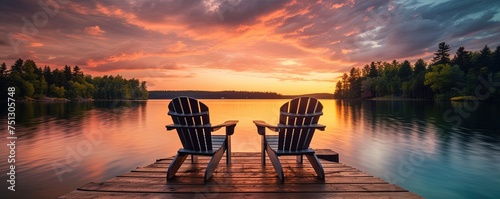Two wooden chairs on a wood pier overlooking a lake at sunset