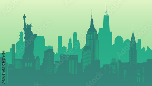 New York City, United States. Silhouette vector background of Manhattan cityscape. Statue of Liberty, Empire State Building, Rockefeller Plaza, Office Building. Travel illustration