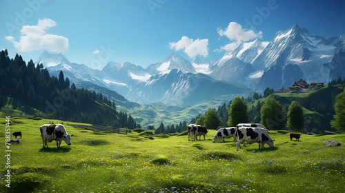 swiss cows are grazing in a flowery meadow, and pine trees at the swiss alps landscape