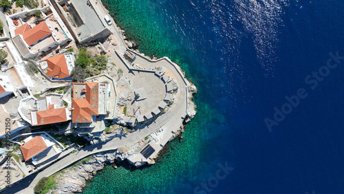 Aerial drone photo of picturesque and historic main village of Hydra or Ydra island well know for captain's mansions and marine tradition, Saronic gulf, Greece