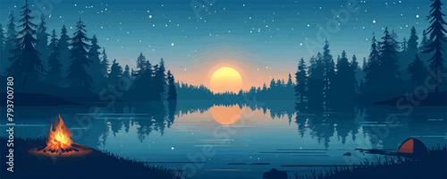 A beautiful lake with a campfire and a large sun in the sky