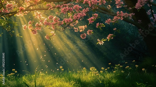 Obraz przedstawia drzewo w pełnym rozkwicie różowych kwiatów, oświetlone promieniami wiosennego słońca