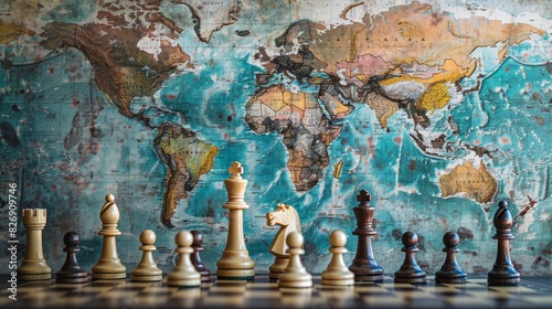 Chess pieces on world map background - Set of chess pieces on a wooden board against the backdrop of a colorful, aged world map, evoking themes of global strategy and power play