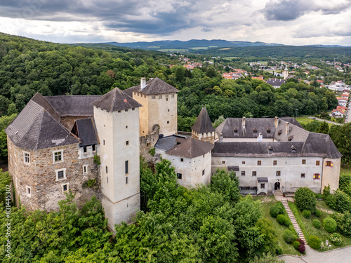 Aerial view of the Burg Lockenhaus Castle in the Burgenland region of Austria. Burg Lockenhaus is 368 metres (1,207 ft) above sea level. The castle was built in Romanesque and Gothic architectural