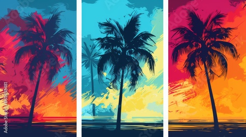 Artistic panels depicting three palm trees with vivid colors and a backdrop of a sunset sky blending blue and orange hues, creating a vibrant and tropical atmosphere.