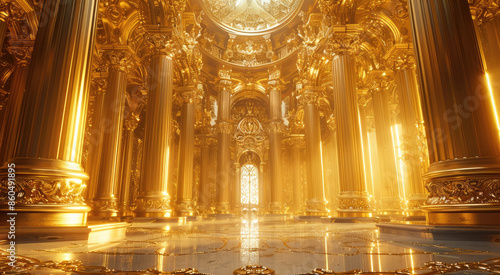A castle made of gold, gold pillars with gold carvings, high quality. Generative AI.