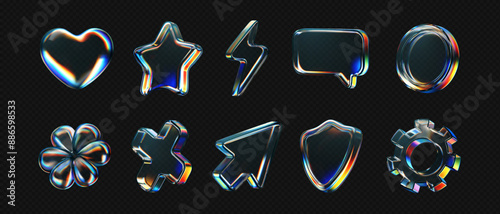 3d glass icon - heart, star, flower, gear, cross, arrow, speech bubble, coin, lightning, protect shield with refraction isolated on dark background. Render transparent glass shape. 3d vector morphism