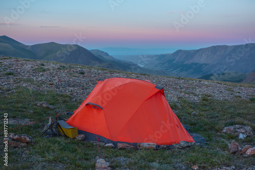 Orange tent on grassy stony pass with view to valley and mountain range silhouette far away under clear sunset color sky. Red tent close up on hill in high mountains under clouds in pure sunset sky.