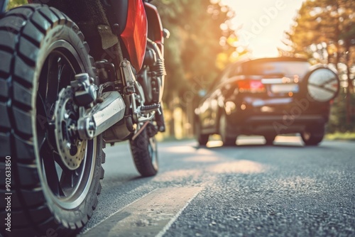A motorcycle lies on its side, while a car is stopped nearby, illuminated by warm sunlight on a calm asphalt road.