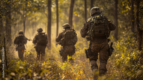 group of soldiers walking throughforest, focused and determined.atmosphere is tense yet serene, with sunlight filtering throughtrees.