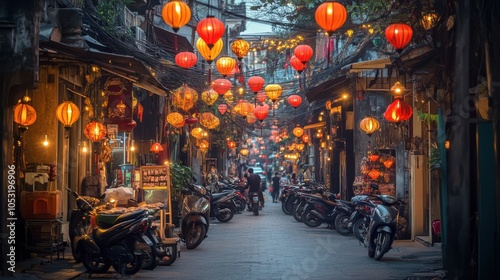 A bustling street in Hanoi's Old Quarter, filled with motorbikes, street vendors, and