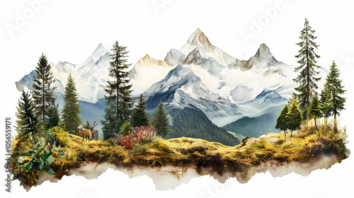 A collage of the swiss alps made of mixed media isolated on white, png. Collage Mixed Media. Illustration