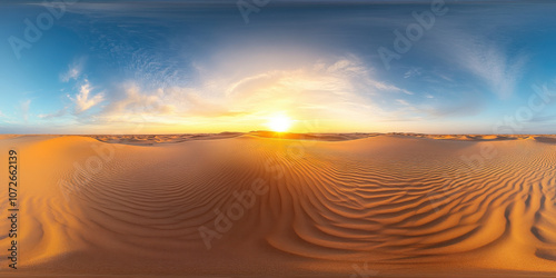 stunning 360 degree HDRI map captures vast sandy desert landscape at sunset, showcasing intricate patterns of dunes and warm glow of sun