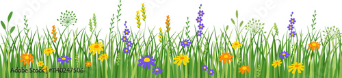Flowers and grass border, meadow flowers and green grass, vector illustration