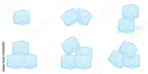 Cartoon-style ice cubes set featuring transparent blue frozen water in various arrangements. Perfect for beverage designs, cocktail illustrations, summer themes, and cooling concepts in vector style.