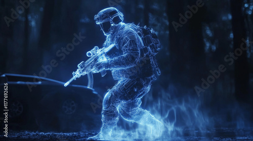 The soldier hologram. Holographic projection military. Flickering energy flux of particles. A soldier with a gun
