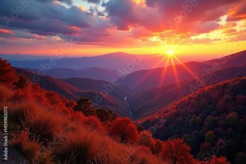 Fiery autumn sunset paints Blue Ridge Parkway, Brevard, NC mountains , serene, golden hour, landscape