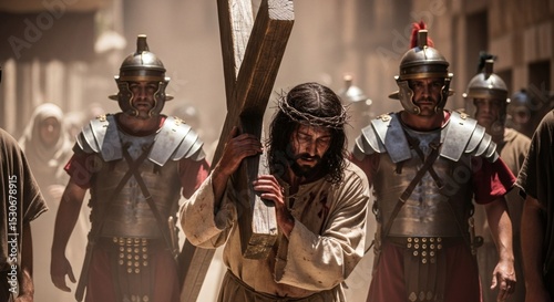 Jesus Christ carrying the cross, escorted by Roman soldiers through ancient streets