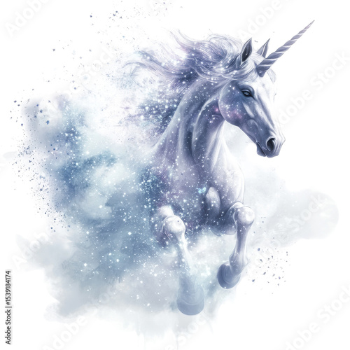 Majestic White Unicorn Leaping Through a Mystical Cloud of Sparkling Magic on transparent background