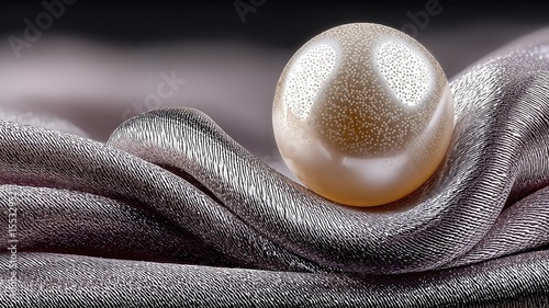 Una perla resplandeciente reposa sobre un lecho de seda plateada, capturando la luz y la elegancia.