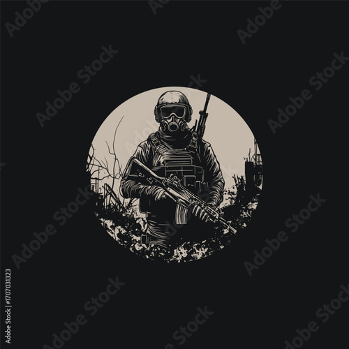 illustration of a soldier or post-apocalyptic survivor wearing a gas mask and tactical gear, holding a rifle and standing in a ruined, desolate environment. Concept for military, war, and survival