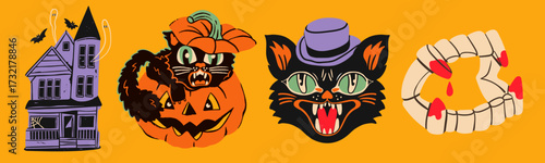 Jack Lantern pumpkin, black cat, haunted house, bloody vampire teeth. Halloween, spooky, scary autumn clip arts. Hand drawn trendy Vector illustration. Isolated design elements. Logo, print templates