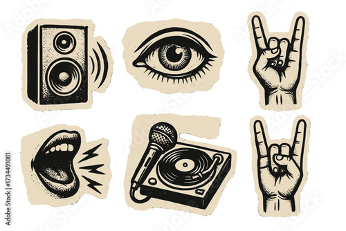 Rock music concert collage. Halftone retro grunge elements set. Vector hand horn sign, speaker, eye, screaming mouth, microphone, vinyl record player. Torn paper stickers.