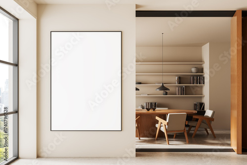 Modern interior with blank poster mockup on beige wall next to stylish workspace and bookshelf in natural light minimalist setting. 3D Rendering