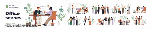 Office communication, collaboration set. Professional conversations of business teams. People, colleagues coworking, discussing during meeting. Flat vector illustrations isolated on white background