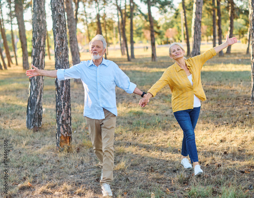 Happy active senior couple meditating and daydreaming and relaxing and nature outdoors