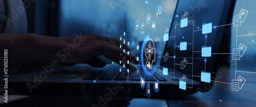 Ai Futuristic holographic interface of a file manager, folder structure with documents and data scanning, digital document storage software, cloud database, search and manage documents, paperless