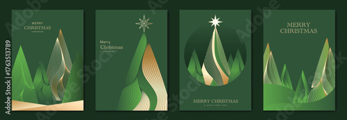 Golden Pine Tree Christmas Greeting Card Vector Set in Green Background for Invitations, Posters, Wall Art, Social Media, Packaging, and Holiday Decorations